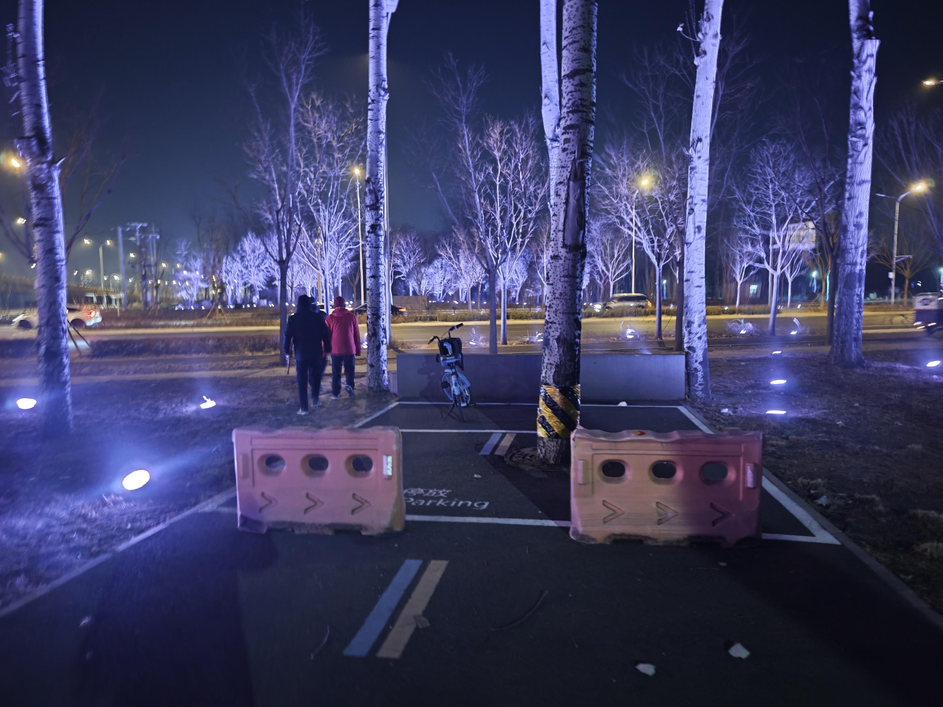 12月6日傍晚,记者来到朝阳公园桥东北侧,在东四环北路辅路与姚家园路交叉口以东,找到了朝阳绿道(望京环-朝阳站段)的入口。绿道上有蓝色和黄色两种颜色的标线,明确标注了蓝色为骑行路线,黄色为步行路线。绿道入口及旁边的小广场上有多盏路灯,可是这些路灯都不亮,四周一片漆黑。沿着绿道向北骑行了约400米,沿途同样漆黑一片,两侧十余盏路灯全都不亮。此时绿道上还有不少人正在骑行或者遛弯儿,大家只能借助远处道路微弱的灯光前行。